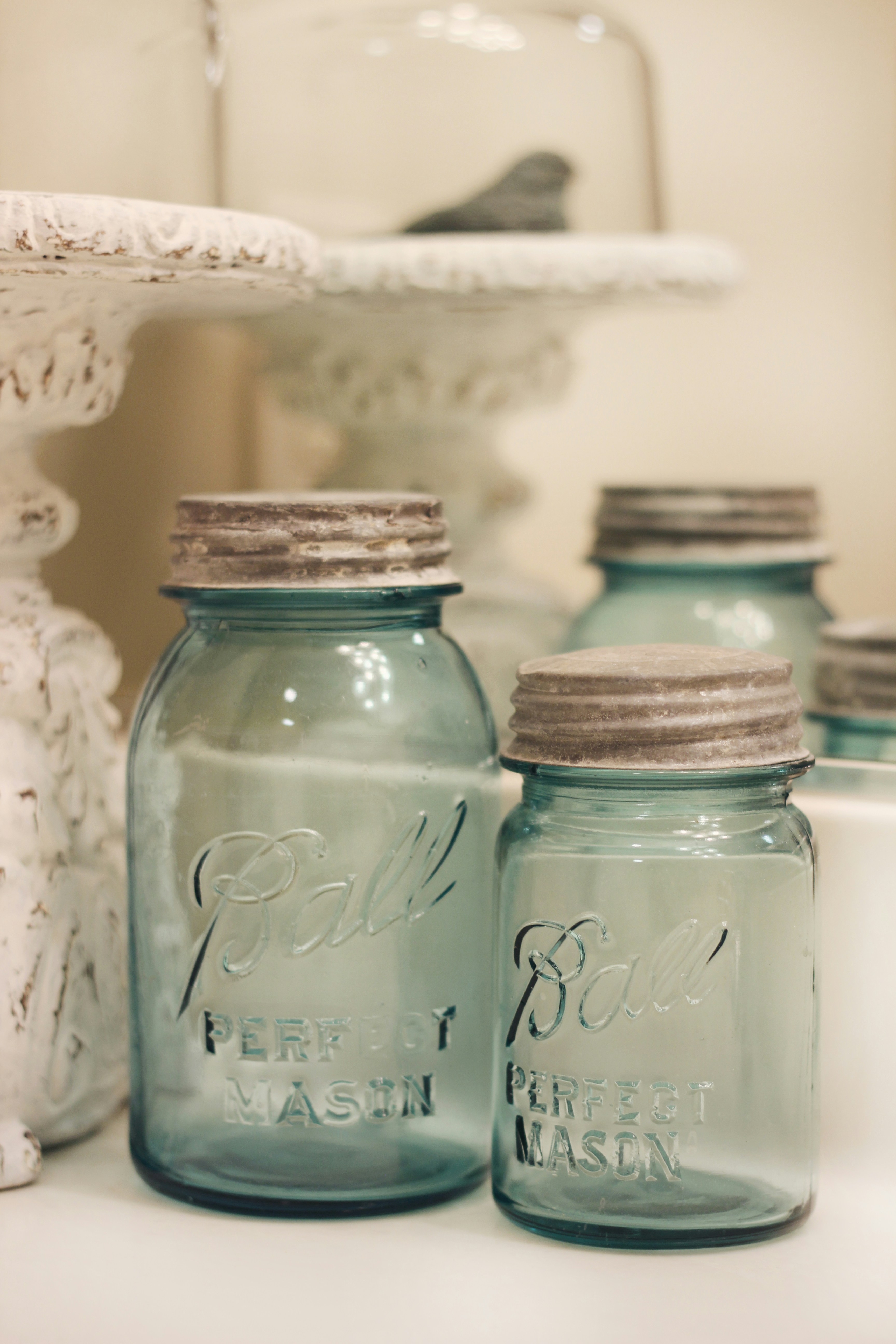 Vintage blue ball jars with zinc lids are displayed on a bathroom countertop as part of farmhouse style decor. Clean white bathroom with vintage objects for decor make this an appealing design choice.
