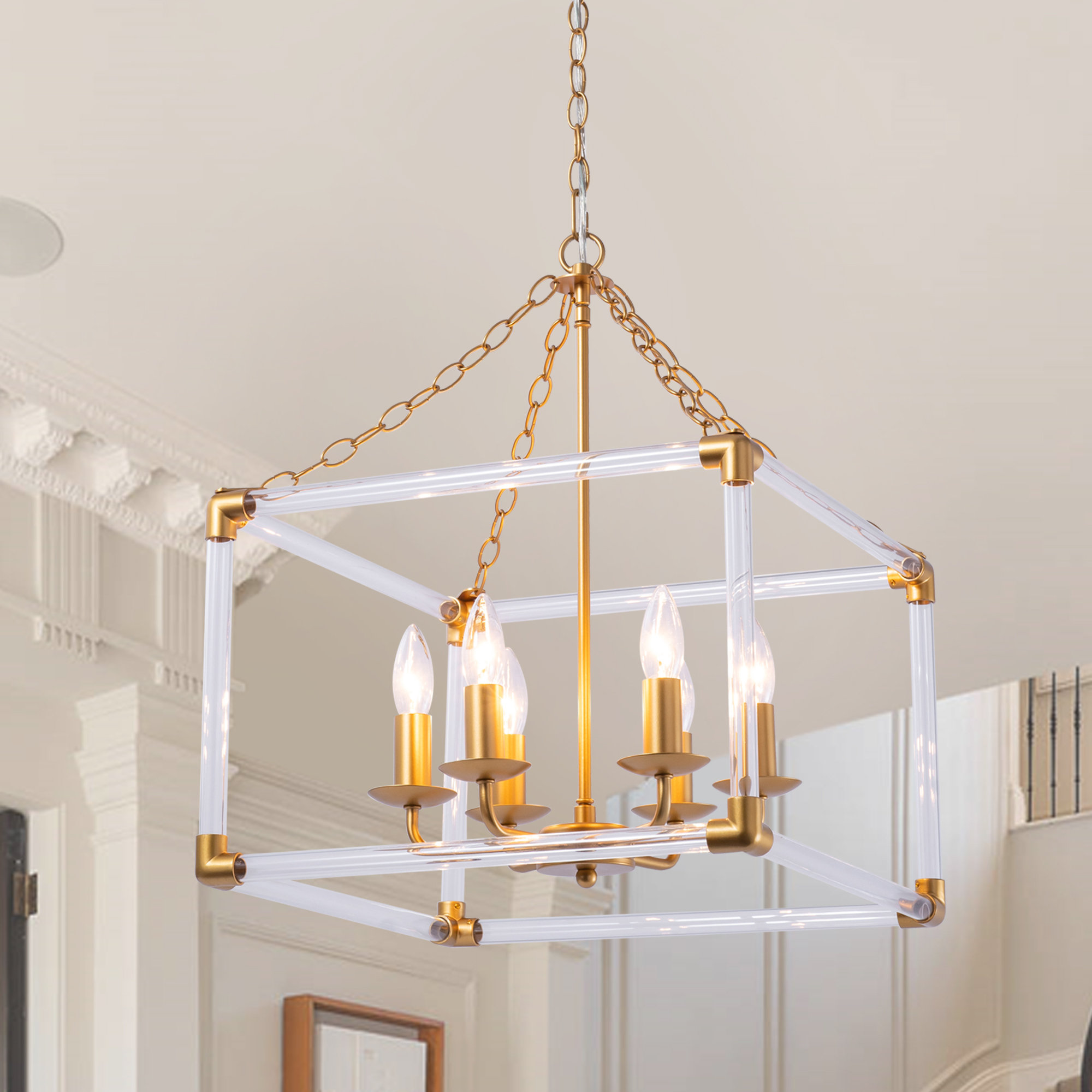 6 - Light Lantern Geometric Chandelier, Brass Finish, Farmhouse Rectangle Chandelier, Modern Pendant Light For Entryway, Dining Room, Kitchen Island, ...