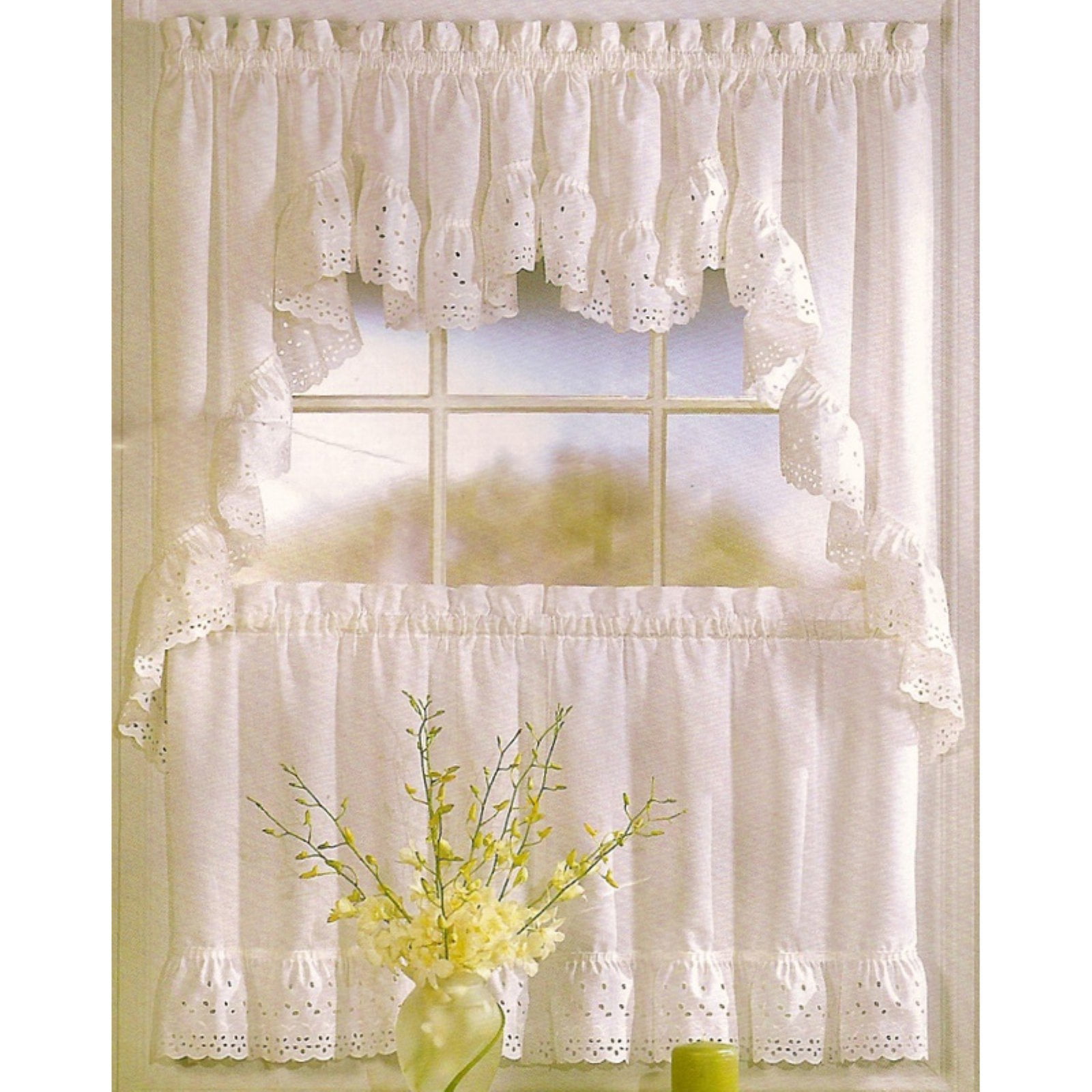 From $19.99 $22.99. 140. Rated 4.5 out of 5 stars. 140 total votes. This valance marries classic sheer voile with scalloped macramé lace edges. This valance will bring a touch of elegance to any kitchen decor. Matching tier and swag panels share the same macramé lace design. Design: Ruffled.