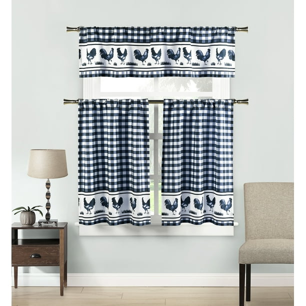 Plaid Checkered Rooster Kitchen 3 Piece Window Curtain Set ...