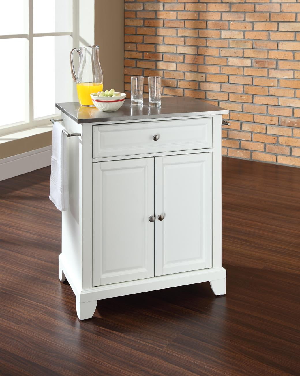 Alexandria Stainless Steel Top Portable Kitchen Island in Classic Cherry Finish, 28-1/4" W x 18" D x 36"H. $357.38. Savannah Full-Size Kitchen Island and Cart with Natural Wood Top and Black Base, 42" W x 18-1/4" D x 37" H. $414.58. Cambridge White Kitchen Island with Stainless Steel Top Constructed of solid hardwood and wood veneers, Constructed of solid hardwood and wood veneers, this kitchen island is designed for longevity. The beautiful raised panel doors and drawer fronts provide the ultimate in style to dress up your kitchen. 2-deep drawers are great for anything from utensils to storage containers.