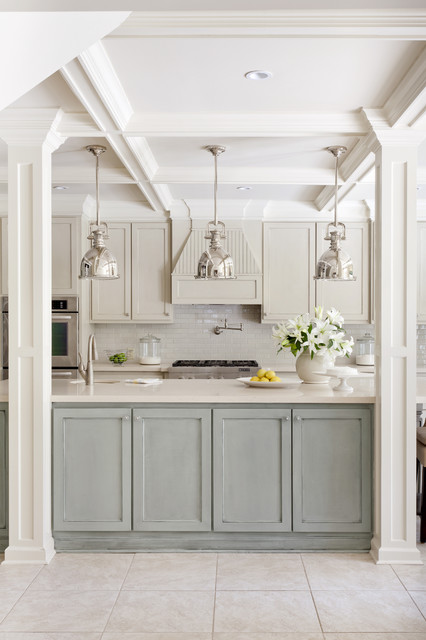 Pleasant Valley Transitional Kitchen, Little Rock Perimeter cabinets are Sherwin Williams Wool Skein and island is Sherwin Williams Topsail, both with a custom glaze, bar pendants and lantern are Visual Comfort, dining Table from Hickory Chair, counter stools and dining chairs from Lee Industries.
