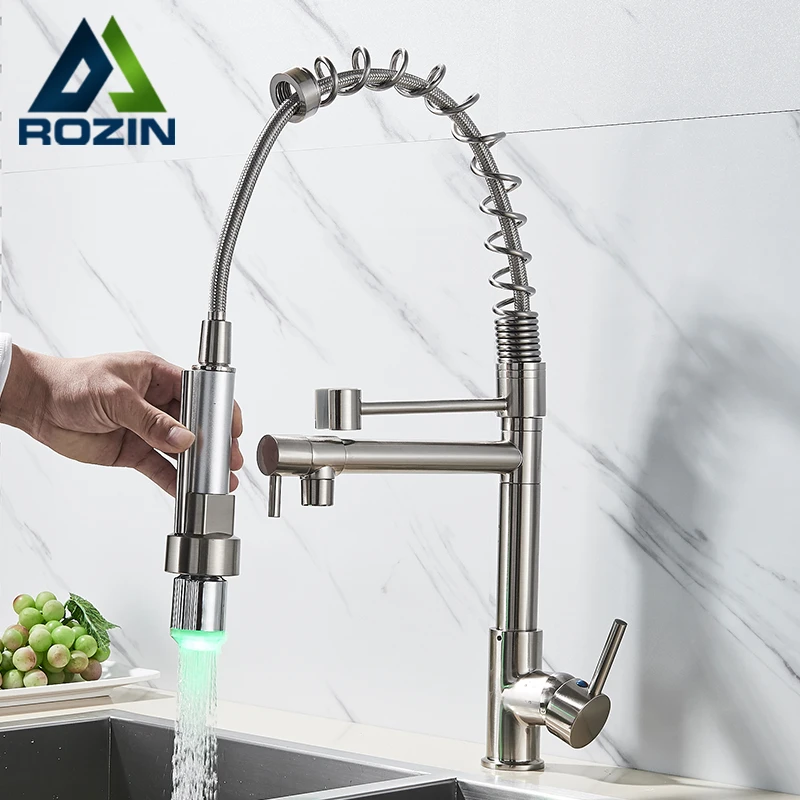 LED Color Changing Kitchen Faucet Mixer Tap Spring Polished Chrome Kitchen Crane Tap Deck Mounted Swive Spout Pull Down Faucet
