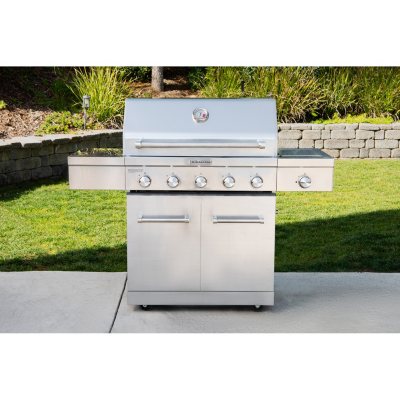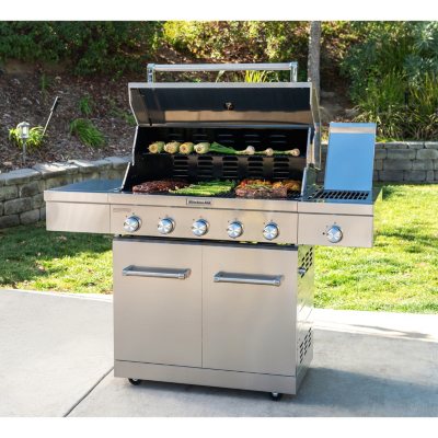 25" KitchenAid Outdoor Gas Grill - Sam's Club Outdoor Grilling & Cooking. This 48,000 BTU, 4 burner gas grill features primary cooking functions including a 645 sq. inch main grilling surface that cooks up to 28 burgers at one time.