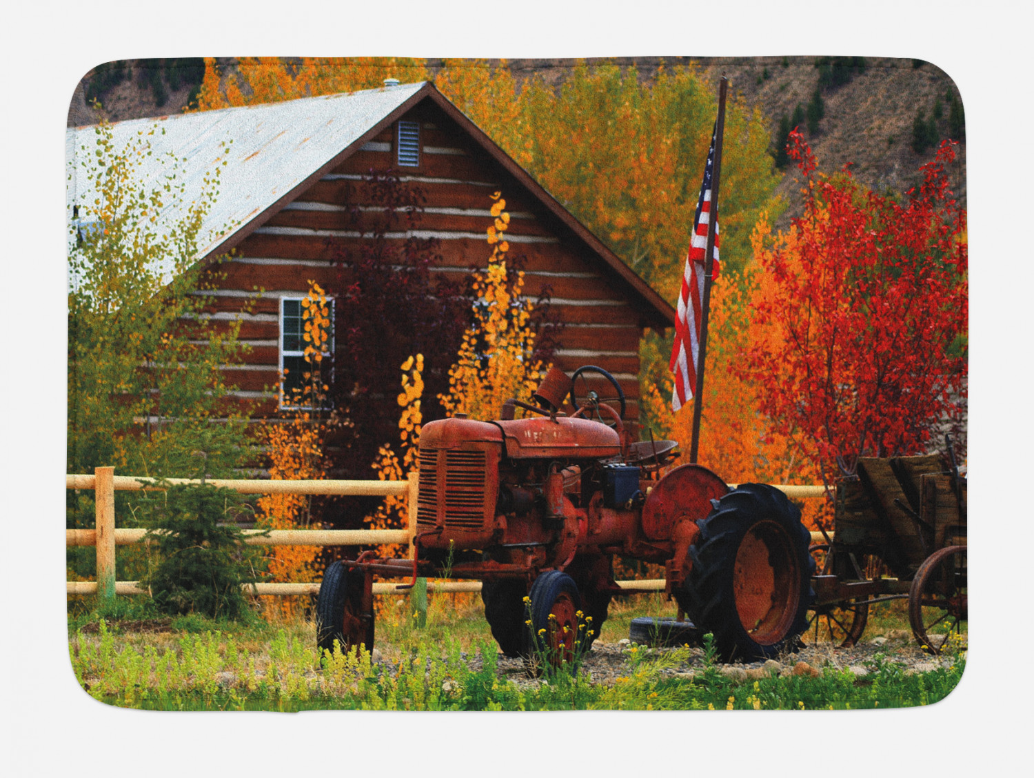 Fall Bath Mat, Rustic Cabin with Rusty Tractor Country Cottage House Seasonal Colors US Flag Loyalty, Non-Slip Plush Mat Bathroom Kitchen Laundry Room ...