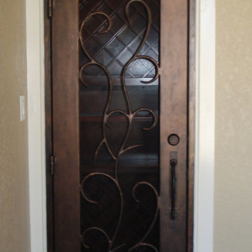 Double Entry Wine Cellar Door Style, Barolo again this time manufactured in Clear Alder with a Chappo Finish.With more glass area a feature wine cellar can be made more visible in the home. On the right a stunning Tuscan Style Custom Wine Cellar Door with Iron detailing. Unusual dual pane rainwater glass, creating the illusion of rain cascading down the glass.