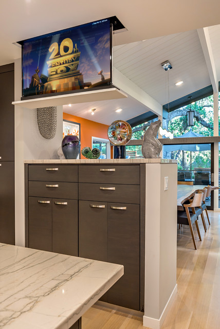 Flip Down Tv - Photos & Ideas | Houzz Browse photos of flip down tv on Houzz and find the best flip down tv pictures & ideas. Custom coffee station with drop down TV/DVD/Internet with a swivel screen. Photo by Sam Van Fleet Inspiration for a contemporary kitchen remodel in Seattle.