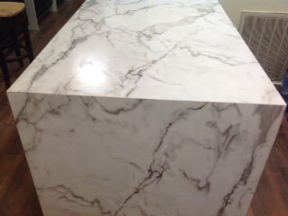 FORMICA 180X IN CALACATTA MARBLE WITH THE AEGEAN EDGE. THE CORNER UNIT LOOKS AMAZING! FORMICA 180X may be cost effective but it is anything but cheap! It is an attractive and durable and affordable counter top option!