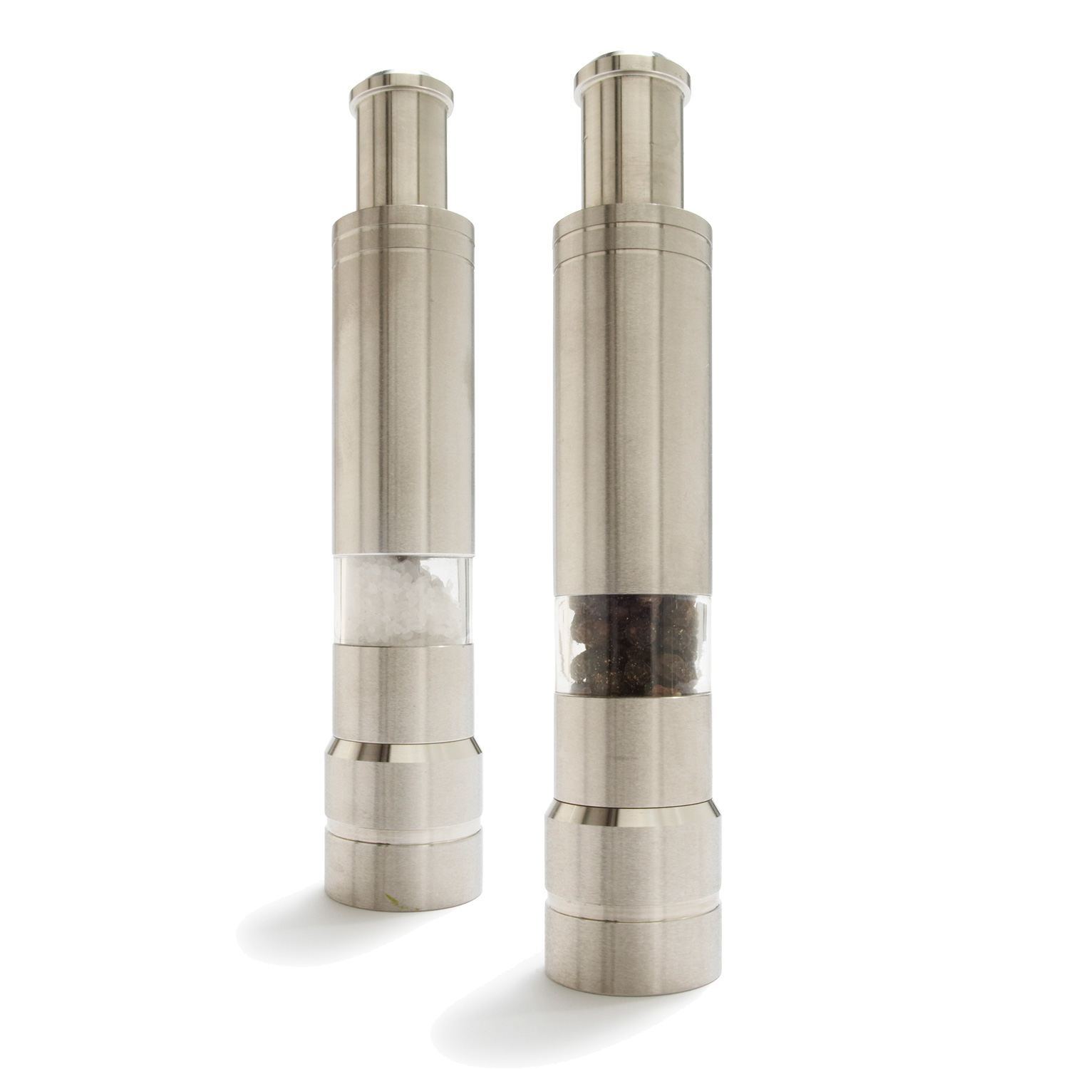 Fletchers' Mill Mini Salt and Pepper Mills 75 Reviews $24.95 each A timely, shorter design for fresh-ground pepper and sea salt. The stature (see additional photos) of these sleek stainless mills doesn't affect their commercial-quality performance, and makes them great for moveable feasts. Stainless steel with view window Wipe with a damp cloth
