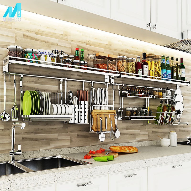 ᑕ ᑐ Kitchen Rail, Kitchen Railing System Stainless Steel Wall Organization Kitchen Rail System You can use a backsplash organizer to hang equipment like pots and pans. Using a kitchen wall organizer system can free up plenty of cupboard space for you to use for something else. You can also choose between different finishes like brass or stainless steel to match the design of your room.