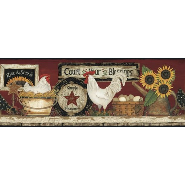 Belote Retro Design American Flag Rooster Fruit Basket Sunflower Watermelon Birdhouse Kitchen 7" L x 180" W Wallpaper Border