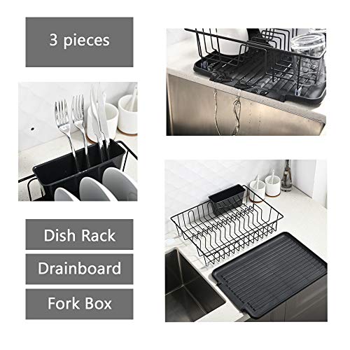 Kitchen Dish Drainer Dish Drain Rack and Drainboard Set Easy-to-install Wooden handle Black Stainless Steel Cutlery Large Capacity Dish Rack for ...
