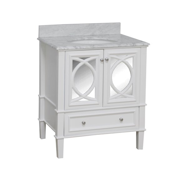 Kitchen Bath Collection KBC5948WTCARR Elizabeth Bathroom ... This bathroom vanity set by Kitchen Bath Collection includes a white cabinet with soft-close doors & drawers, Italian Carrara marble countertop with stunning double-thick beveled edges, undermount ceramic sink, pop-up drain, and P-trap. Order now and we will include the pictured three-hole faucet and a matching backsplash as a free gift!