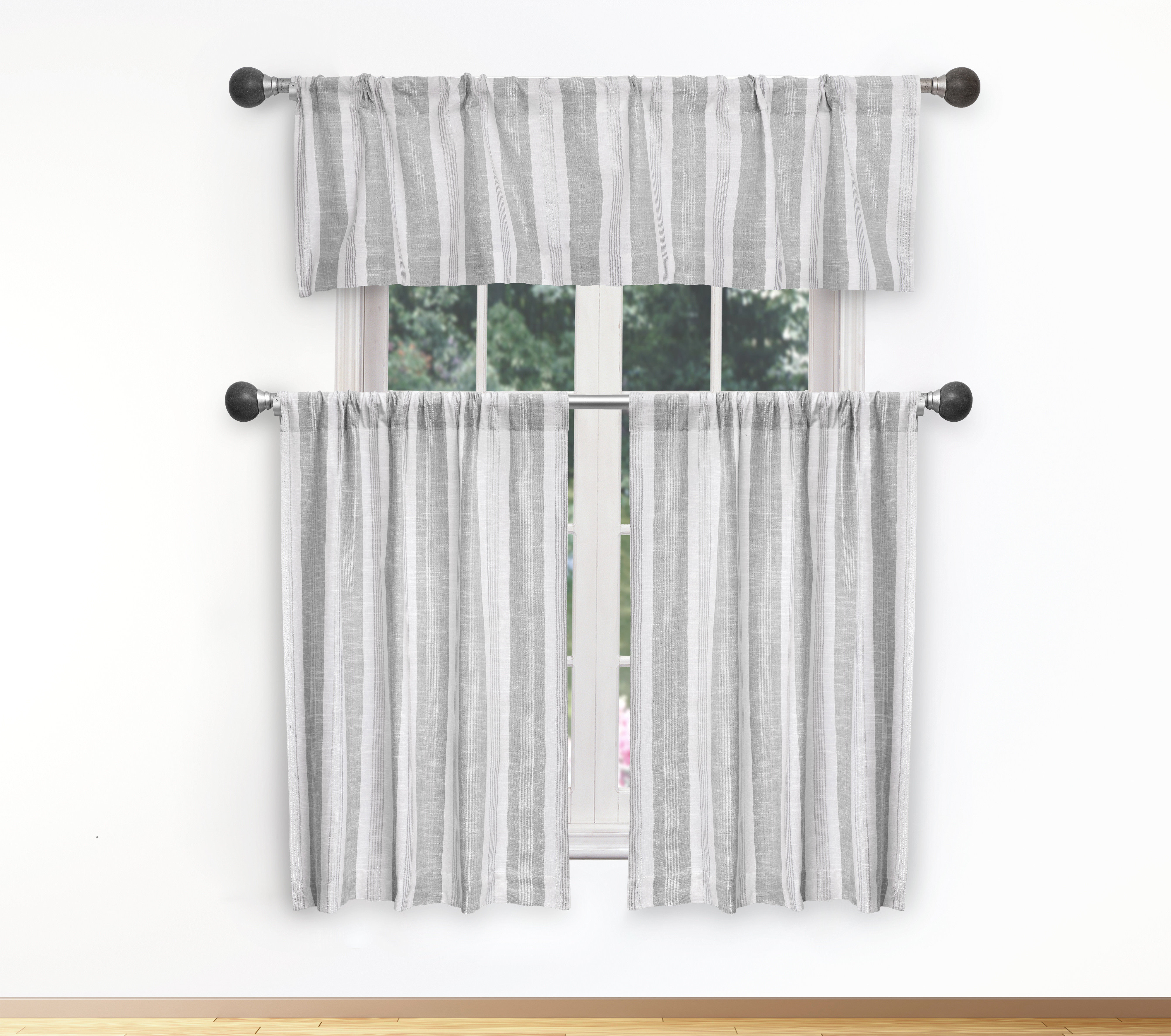 Gray Kitchen Curtains | Bed Bath & Beyond Curtainworks McKenzie Window Curtain Tier Pair and Swag Valance in Grey. $13.99 - $19.49. Martha Stewart. Martha Stewart Laguna Stripe 36-Inch Kitchen Window Curtain Tier Pair & Valance Set. 14. 14 reviews. $23.99 - $24.99. McKenzie 2-Pack 36-Inch Striped Kitchen Window Curtain Tier Pair in Grey. 7.