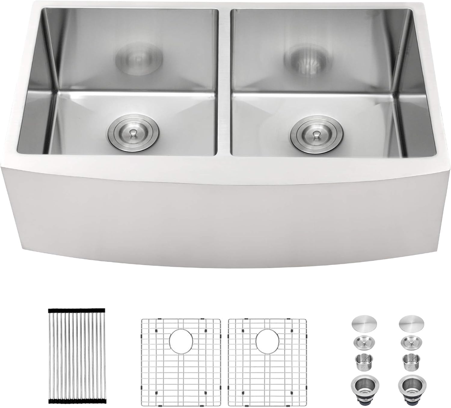 Farmhouse Apron Sinks | Apron Sinks | Farm Apron Sinks 36 Inch Stainless Steel Flat Front Farm Apron 50/50 Double Bowl Stainless Steel Kitchen Sink Premium Package 15mm Radius Design SKU: ARL-HFE3621R Featuring a two-well configuration, this beautiful farmhouse style sink offers plenty of depth for tackling pots and pans.