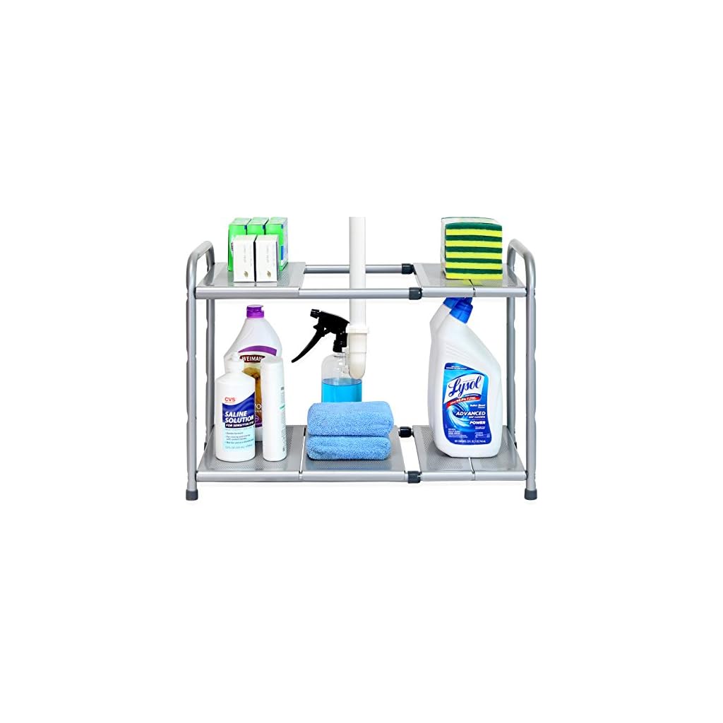 SimpleHouseware Under Sink 2 Tier Expandable Shelf Organizer Rack, Silver (expand from 15 to 25 ...