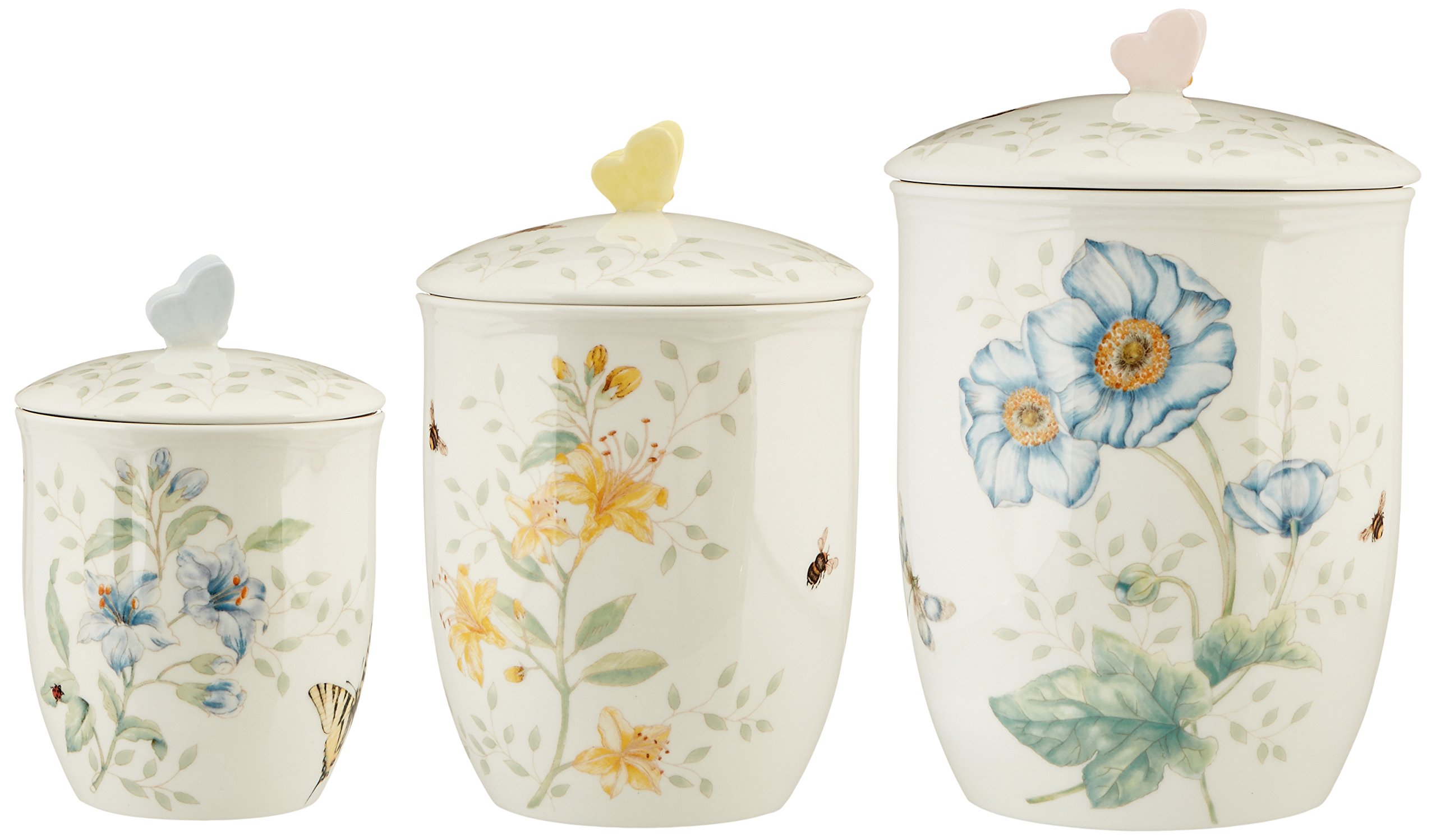 Sales on Lenox Butterfly Meadow Canister Set Lenox Butterfly Meadow Canister Set. A sculpted butterfly serves as the finial on the lid of each canister in this Butterfly Meadow Canister Set from Lenox. Each canister is decorated with a garden scene evoking the beauty of butterfly meadows. Materials: Porcelain Care instructions: Handwash Number of pieces in set: Three (3) Dimensions: 5.75 ...