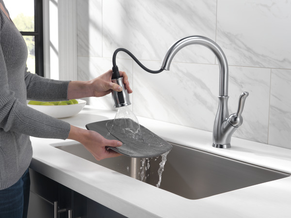 Reviews for Delta Leland Single-Handle Pull-Down Sprayer ... Hi Russ, Thank you for your review on the Delta Faucet model 9178-AR-DST Single Handle Pull-Down Kitchen Faucet With ShieldSpray® Technology In Arctic Stainless! We are happy to hear that this product met your expectations and we would be more than happy to assist you. Thank you for being a loyal Delta customer. Single Handle Pull-Down Kitchen Faucet with ShieldSpray ... 1 or 3-hole 8" installation Optional escutcheon included for use with additional mounting configurations and a cohesive look ADA Compliant The high-arc, gooseneck design swivels 360 degrees with a 20-in. retractable hose for added convenience during everyday kitchen tasks Technology Diamond Seal ® Technology ShieldSpray ® MagnaTite ® Docking