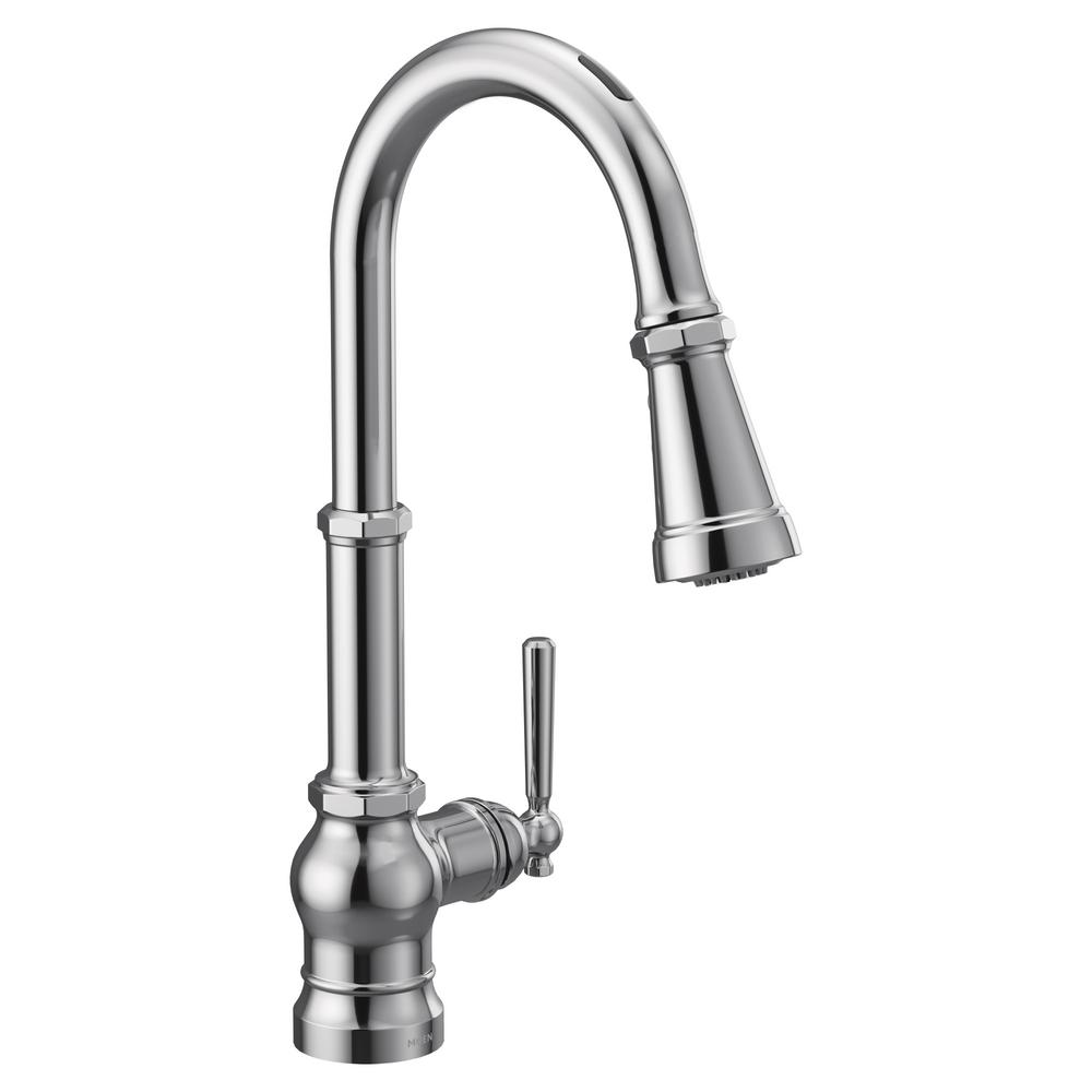 MOEN Brecklyn Single-Handle Pull-Out Sprayer Kitchen Faucet with Power ... The MOEN Banbury Single-Handle Pull-Out Sprayer The MOEN Banbury Single-Handle Pull-Out Sprayer Kitchen Faucet in Chrome offers a timeless and traditional look that is both classic and sensible. The pull-down sprayer features 2 functions that can be activated with the simple click of a button.