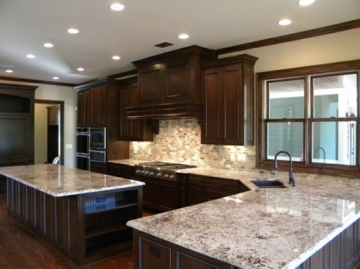 Colonial Cream Kitchen Granite Counters | Marble.com Colonial Cream granite counter tops line the cabinets of this lovely suburban kitchen. The beautiful natural variations of granite provide an artistic touch for the room. Dark cherry cabinets produce a warm and inviting vibe that is complimented by a mosaic backsplash. Materials Used: Colonial-Cream. Primary Edge: Quarter ROUND. Secondary Edge ...