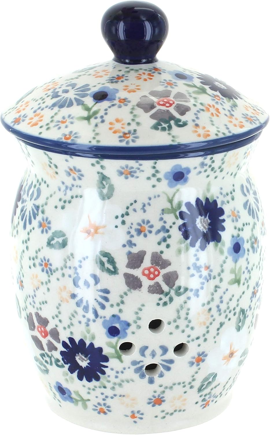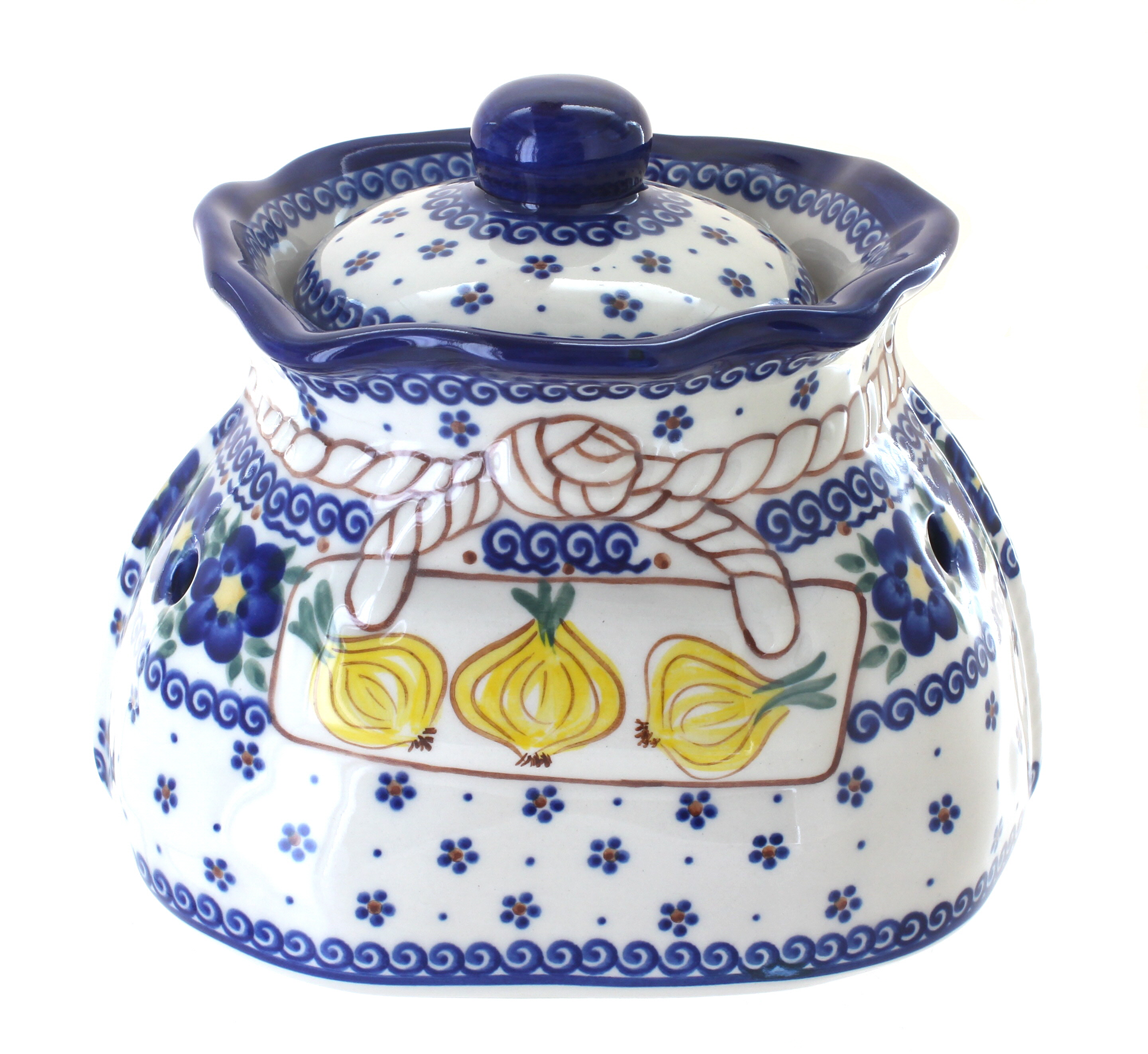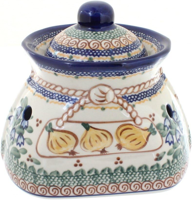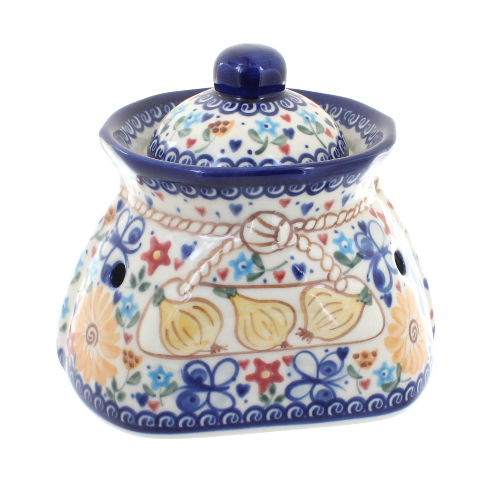 Garlic Keeper | Old World Polish Pottery Garlic Keepers Manufactured By: Ceramika Artystyczna A beautiful place to store garlic and onions.. This piece measures 7.20″ high, 6.30″ wide and 7.20″ long. This handmade and hand-painted pottery is fired at temperatures up to 3,000 degrees Fahrenheit, making it not only durable but impervious to abrasives and resistant to cracks and chips.