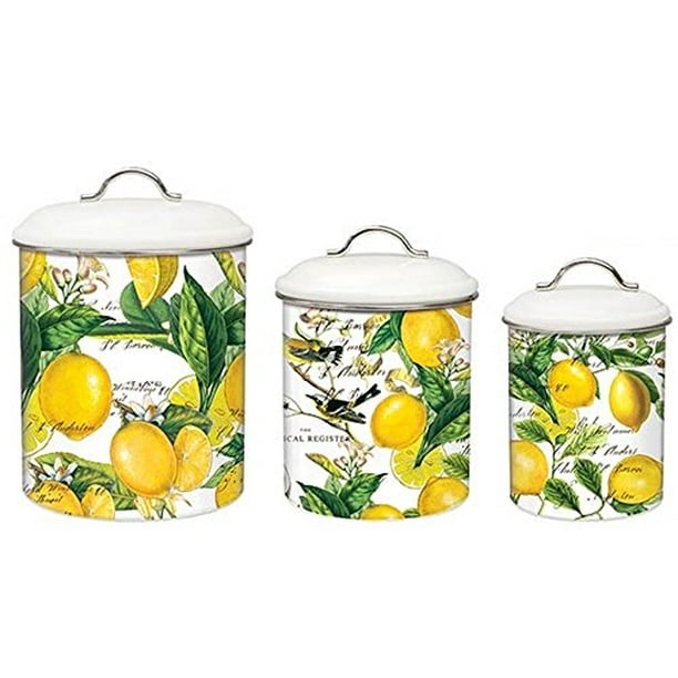 3-Piece Metal Kitchen Canister Set, Tuscan Grove, Set of 3 metal canisters with snug-fitting lids and chrome-plated handles By Michel Design Works