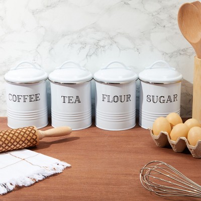 Farmhouse Canister Set, White Metal Kitchen Containers with Lids (4 x 6 ... This 4-piece white metal canister set is ideal for storing dry foods while simultaneously sprucing up your farmhouse kitchen decor. The airtight lids will ensure your coffee, flour, tea, and sugar stay fresh and secure. Each farmhouse canister measures 4 x 6.3 inches and holds 3.5 cups. Product information Technical Details Additional Information