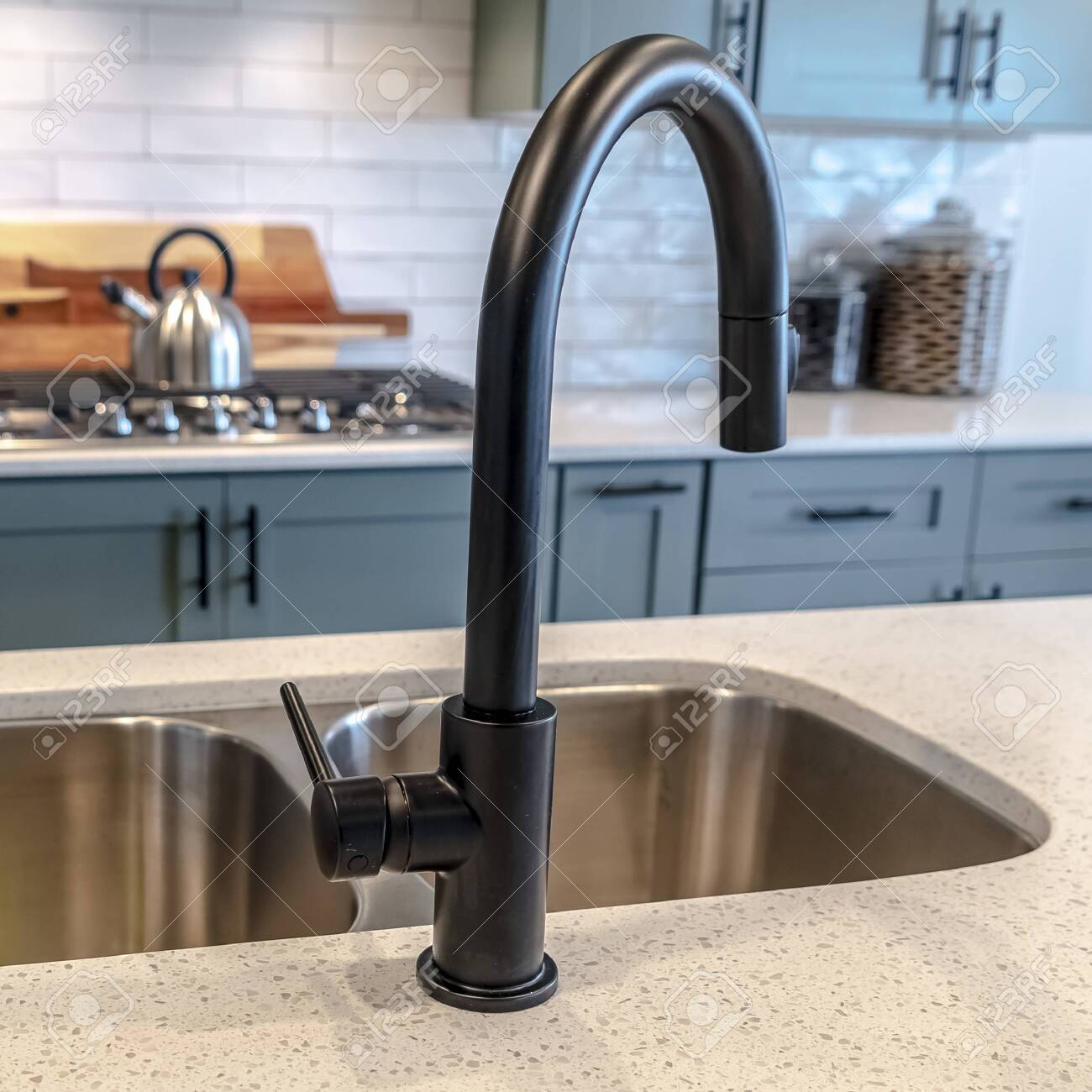 Kitchen Sink Backsplash - Photos & Ideas | Houzz A slate blue glass subway tile adorns the backsplash. We fitted the kitchen with a stainless steel apron sink. The same white and brown color palette has been used for the island. We also equipped the island area with modern pendant lighting and bar stools for seating. Project by Portland interior design studio Jenni Leasia Interior Design.