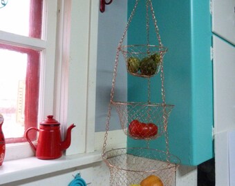 RSVP 3-Tier Copper Wire Hanging Baskets - Everything Kitchens The RSVP copper wire 3-tier hanging basket will be a beautiful addition to your kitchen, porch, or house. This elegant basket can hold up to ten pounds, and has three tiers, an 8-inch, a 10-inch, and a 12 inch. This basket is sure to brighten up whatever spot you hang it in.