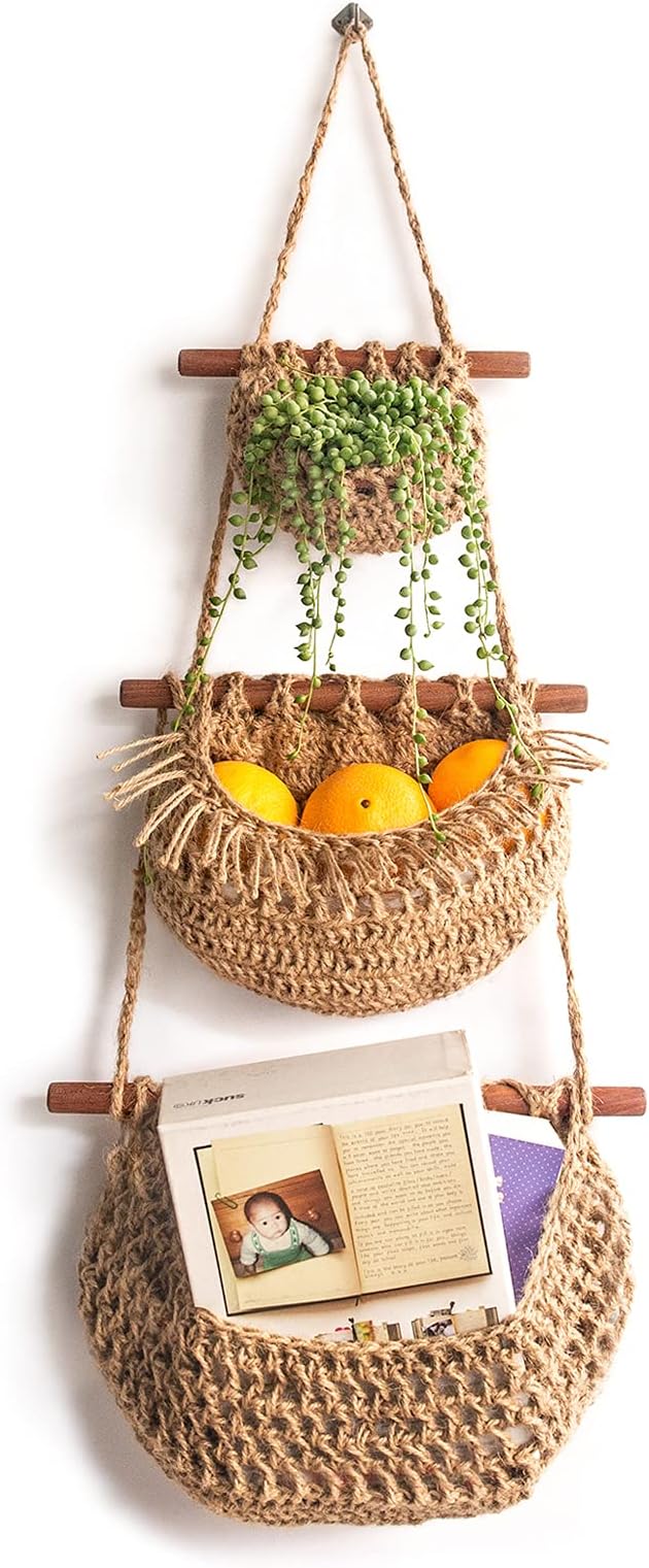 Hanging Fruit Basket, 3 Tier Jute Hanging Wall Baskets, Hand Woven ... Folkulture 3 Tier Hanging Fruit Basket for Kitchen, Macrame Hanging Basket for Fruit and Vegetable Storage, Boho Wall Baskets for Organizing, Boho Decor for Indoor Plants, 46 Inches Long 4.7 out of 5 stars 291