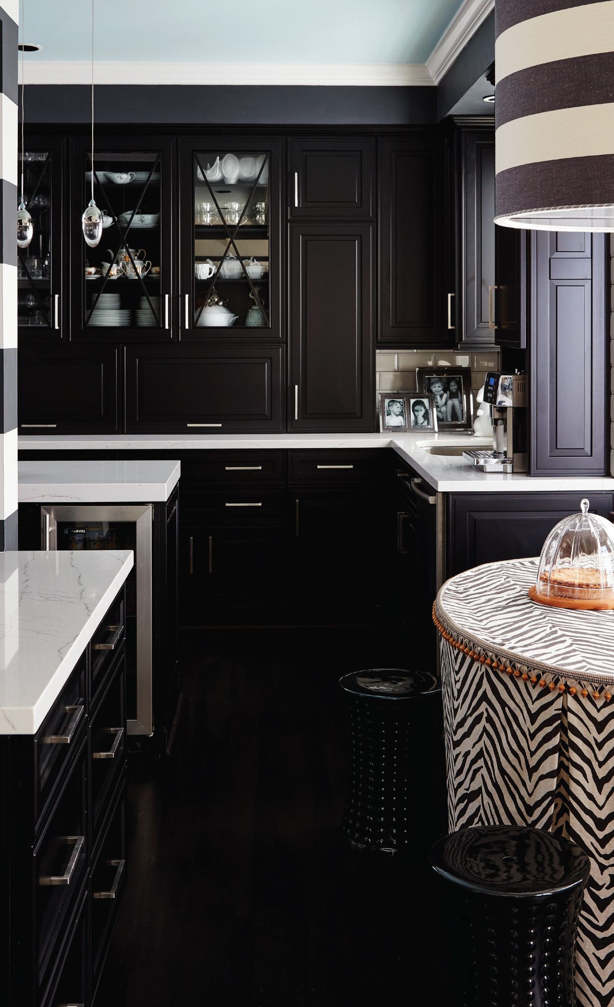 Black Cabinets With Marble Countertops Design Ideas - DecorPad Black and white wet bar designed with rippled glass cabinet doors and marble -like counter and backsplash slabs. Bria Hammel Interiors Glass front cabinets are stacked over white shaker cabinets contrasting black shaker base cabinets fitted with a microwave drawer located under a honed marble countertop. Kelsey Leigh Design Co