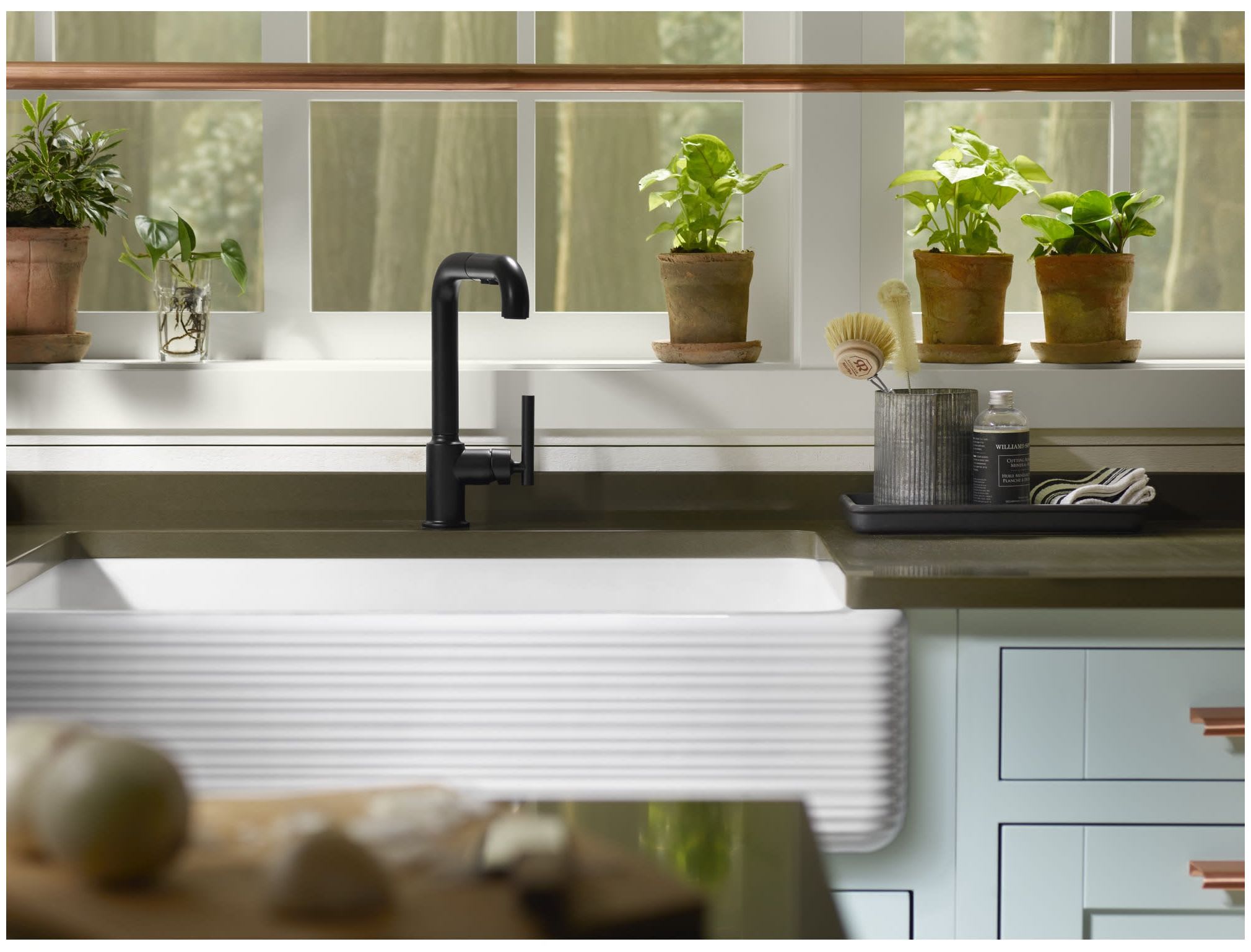 Kohler K-7505-BL Purist 1.5 GPM Single Hole Pull | Build.com Designed to accommodate extra-thick counters, this Purist kitchen faucet combines minimalist style and simple-to-use features. Featuring a single lever ...