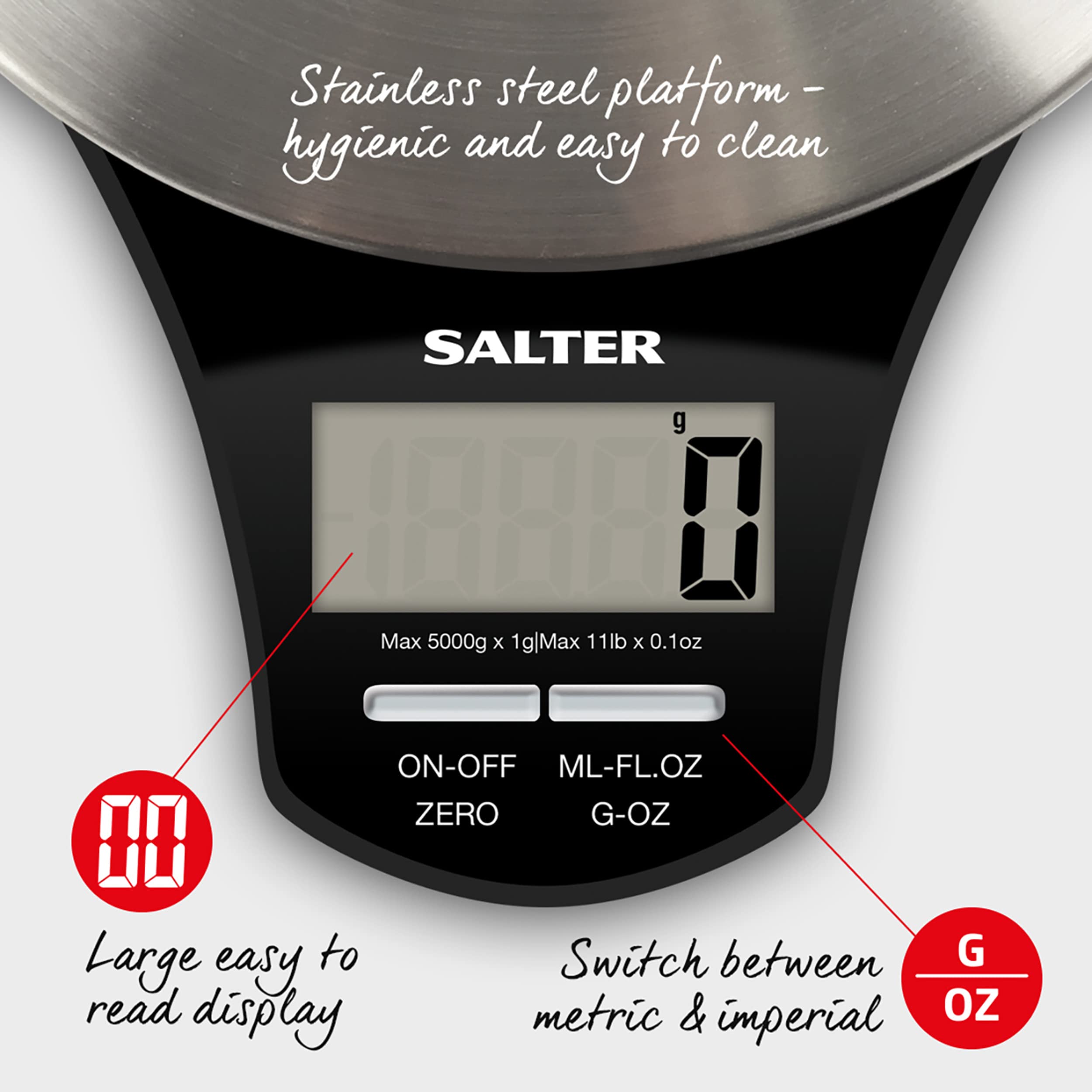 Salter Stainless Steel Digital Kitchen Weighing Scales - Electronic Cooking Scale Appliance for Home, Weigh Food with Accurate Precision up to 5kg, ...