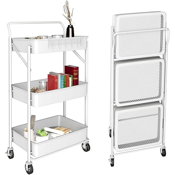 3 Tier Rolling Cart with Wheels - Foldable Metal Organizer Storage Carts with Hooks, Free Installation Utility Trolley, Enlarge Quiet Wheels with ...