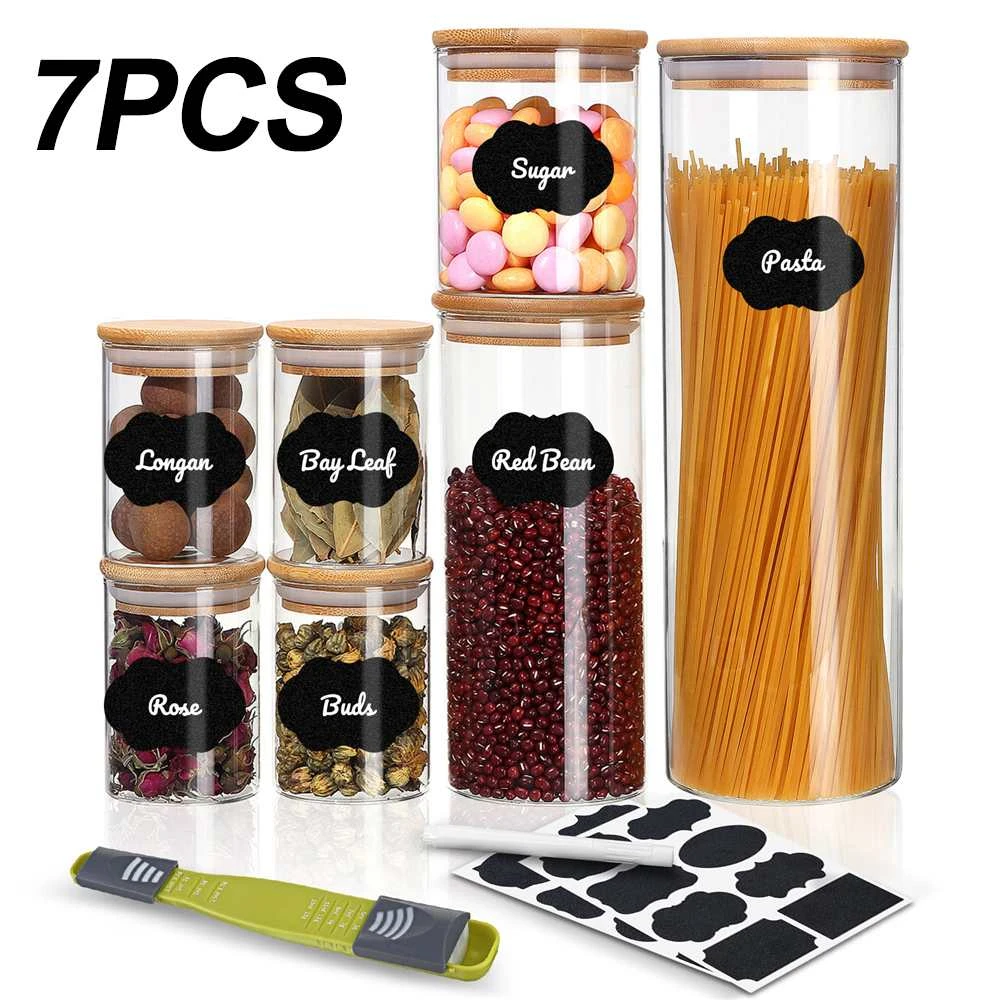 7Pcs/Set Wood Lid Glass Airtight Canister Kitchen Storage Bottles Jar Sealed Food Container Tea Beans Grains Candy Organizer